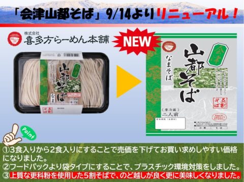 「会津山都そば」9/14リニューアル! 2024年9月7日 現在スーパー等で好評いただいております「会津山都そば」が、3食入りから2食入りとお買い求め安い価格に変更しパッケージもニューアルとなります。 【蕎麦のイメージ画像】 喜多方市熊倉町の蕎麦畑から喜多方市を眺望