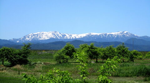 自社の駐車場から見た『飯豊連峰』。残雪があり、青と緑のコントラストが美しいです。