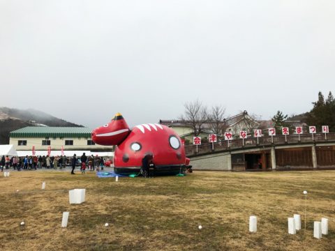 会津柳津の冬まつり 2020年2月1日 時折雨の降る中、丑寅年生まれの守本尊として知られる会津柳津虚空蔵尊がある会津柳津冬まつりに行って来ました。 ※会場内にある赤べこのふわふわドームが目を引きます。 到着した時 柳津名物「あわまんじゅう」 の早食い大会が行われていました ○(^-^)o♪ ganbare! 柳津名物赤橋を入れて柳津虚空蔵尊を撮影しようと思いましたが、結構雨が降っていたので断念して赤橋だけ撮影しました┌○ pekori