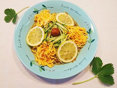 すだち果汁だれの冷やし中華に具材の定番であるトマト、錦糸卵、ハム、キュウリをトッピングし最後に家庭菜園で収穫したパクチーを載せて出来上がりです。少しのパクチーでも十分なエスニック感を味わえます(*^^*)
