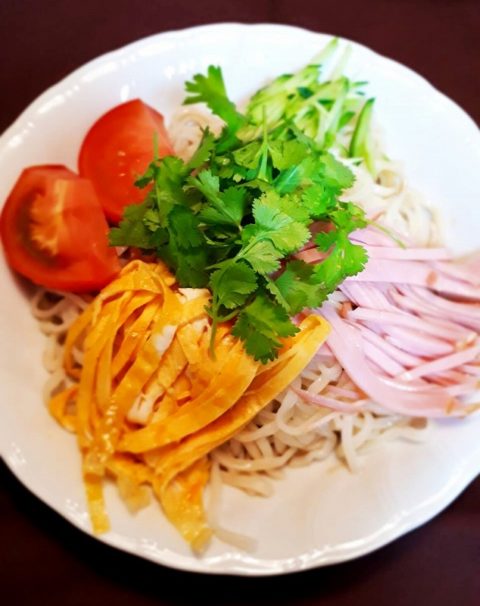 すだち果汁入りエスニック冷やし中華 レシピ提供者:Y村Ⅰ様 生麺、すだち果汁入り冷やし中華だれ、トマト、錦糸卵、ハム、キュウリ、パクチー すだち果汁だれの冷やし中華に具材の定番であるトマト、錦糸卵、ハム、キュウリをトッピングし最後に家庭菜園で収穫したパクチーを載せて出来上がりです。少しのパクチーでも十分なエスニック感を味わえます(*^^*)